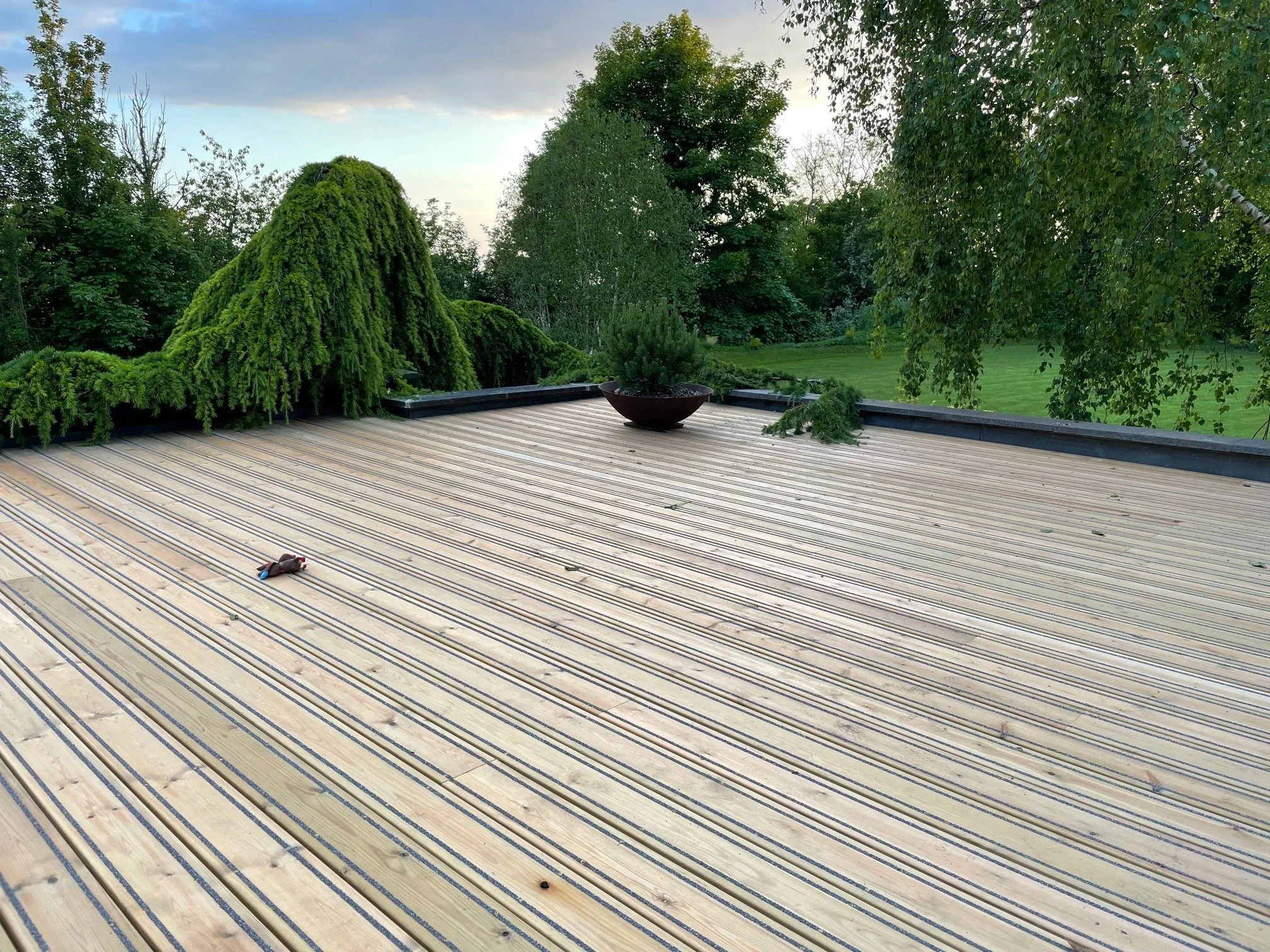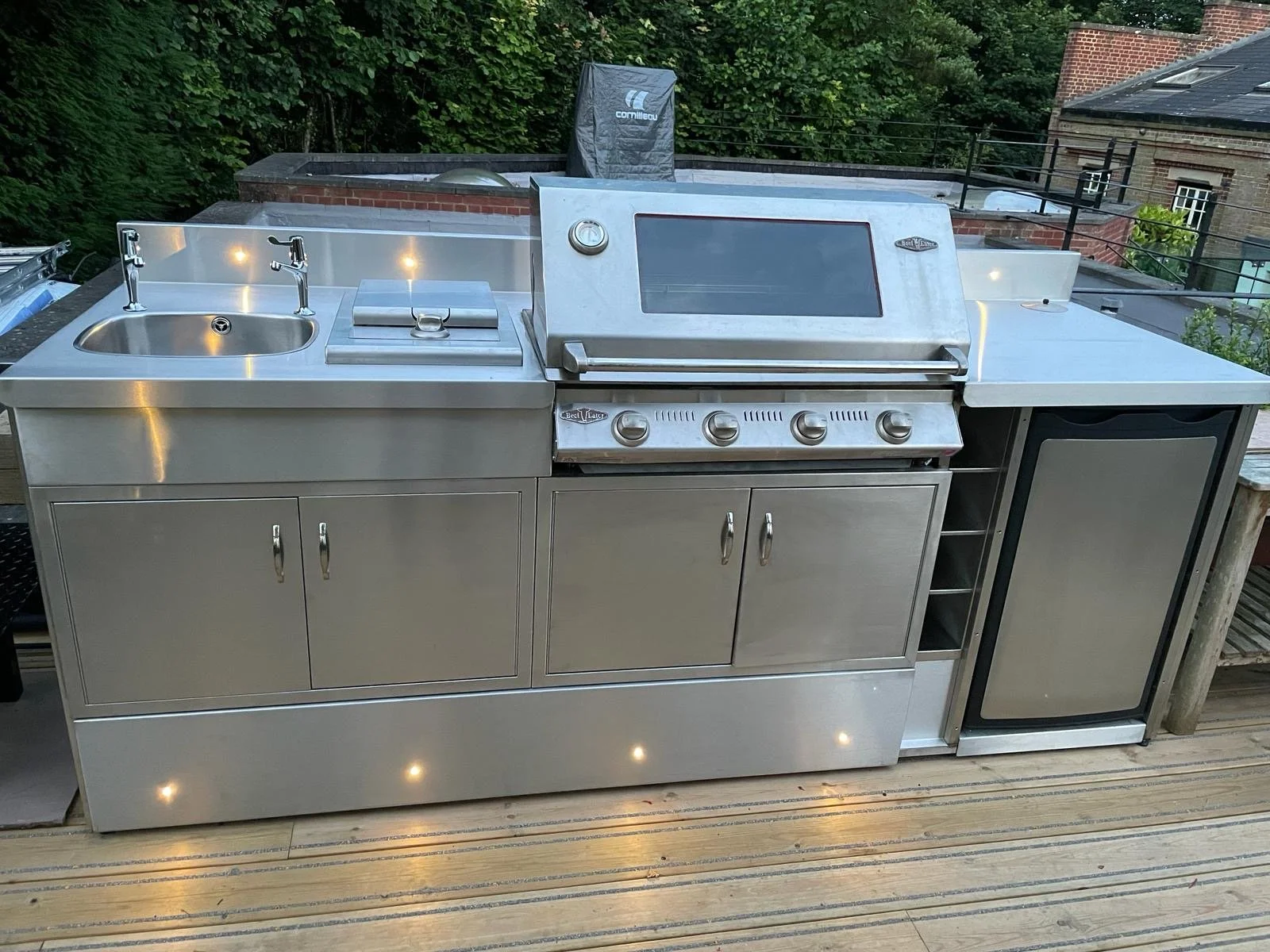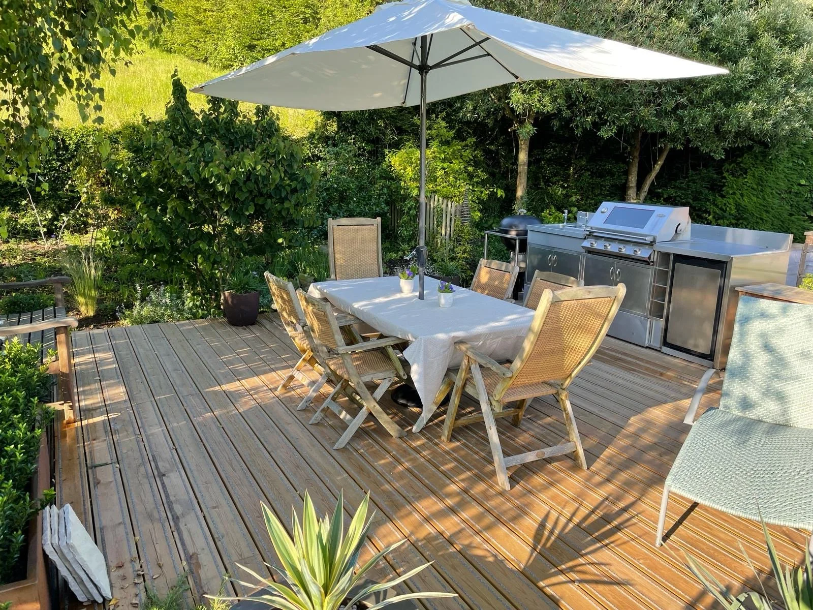 The available space was accessed via new steps leading up from the drive to the side of the garage. We placed pressure treated non slip decking over roof with bespoke guttering, irrigation and lighting schemes. The hand-built stainless steel BBQ/kitchen were our own design, all illuminated and with built-in power and charging points/Wi-Fi.